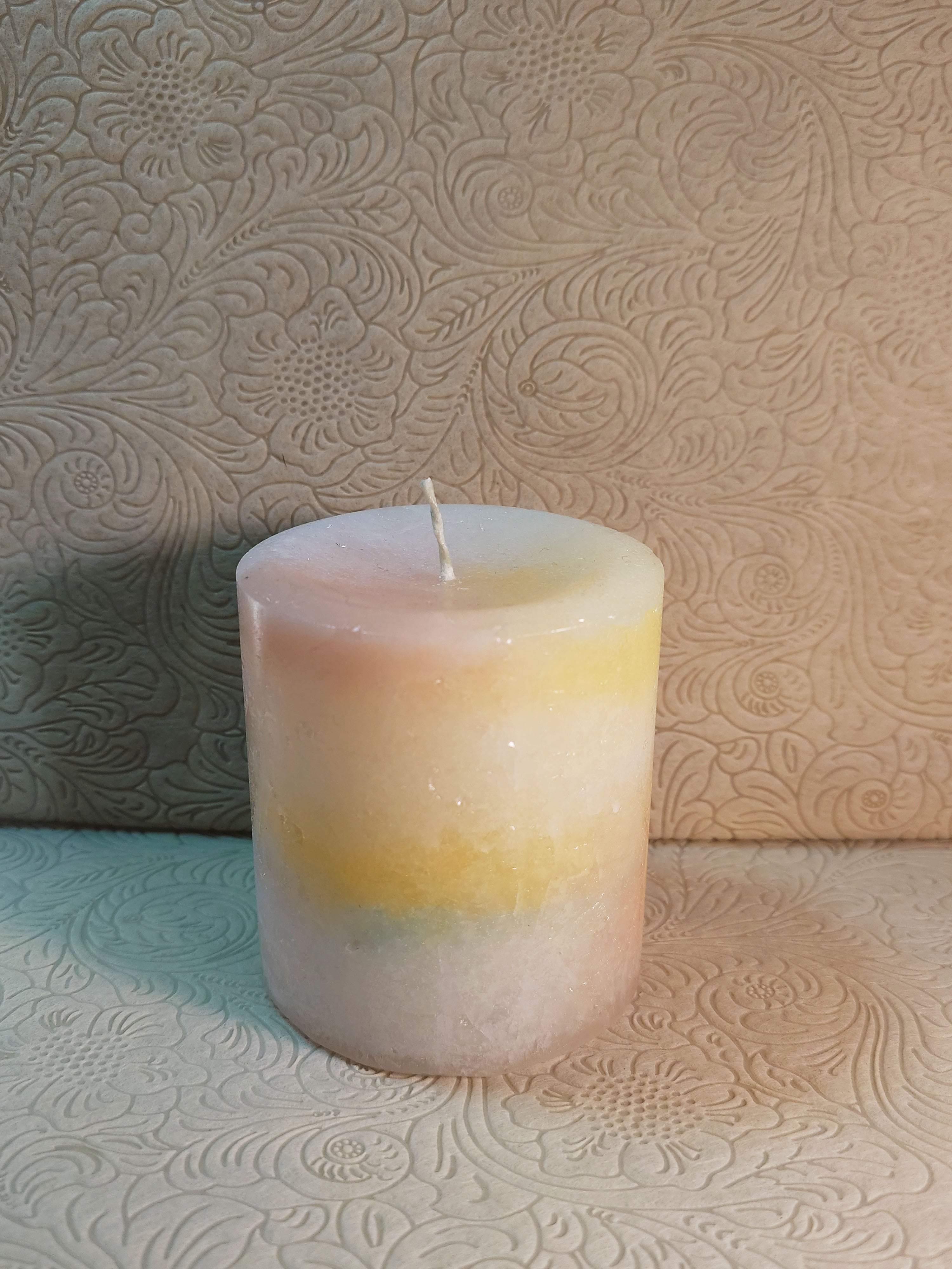 ペールカラー(イエロー、オレンジ、ソーダブルー、白)のミックスカラーのキャンドルにゴールドで蓮を描いています。