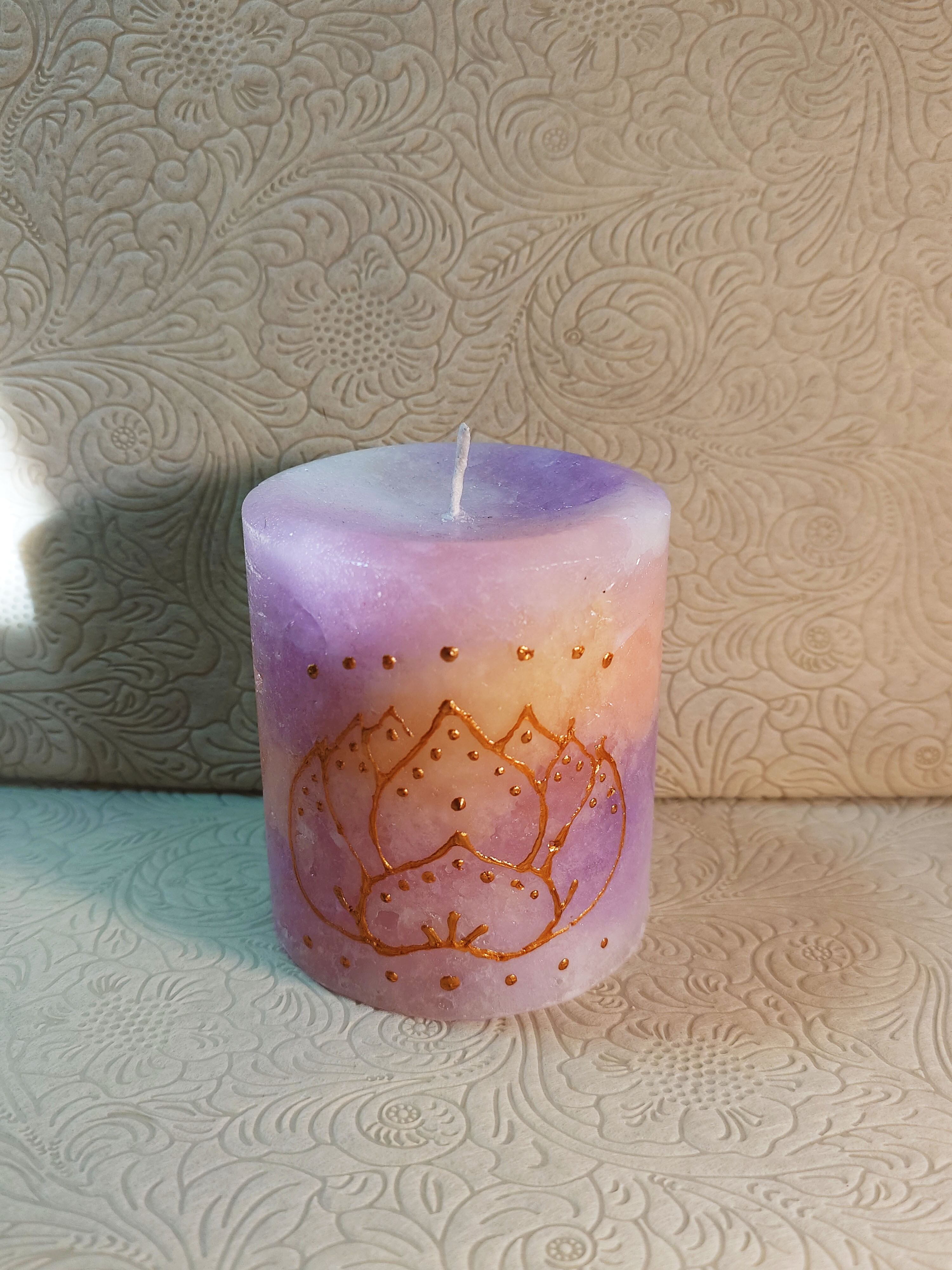 ペールカラー(ピンク、オレンジ、パープル、イエロー、ホワイト)のミックスカラーのキャンドルにゴールドで蓮を描いています。