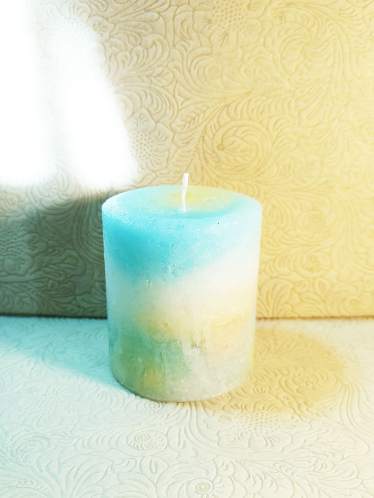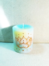 ペールカラー(ソーダブルー、イエロー、ピンク、ホワイト)のミックスカラーのキャンドルにゴールドで蓮を描いています。