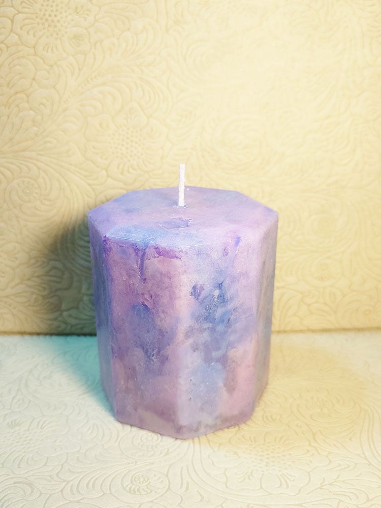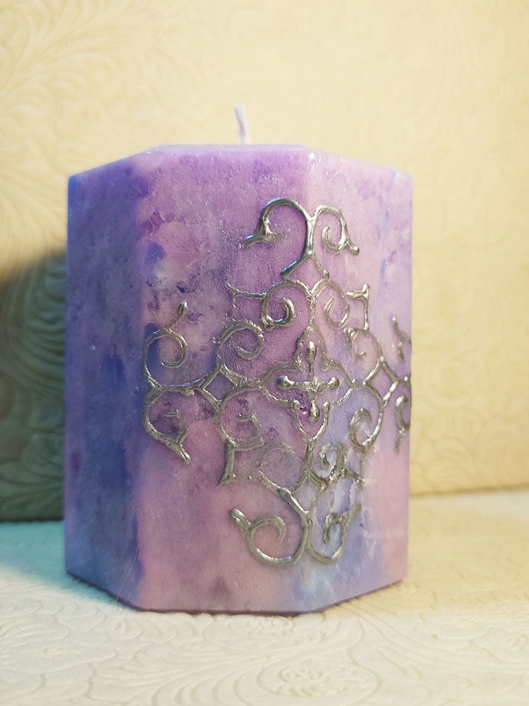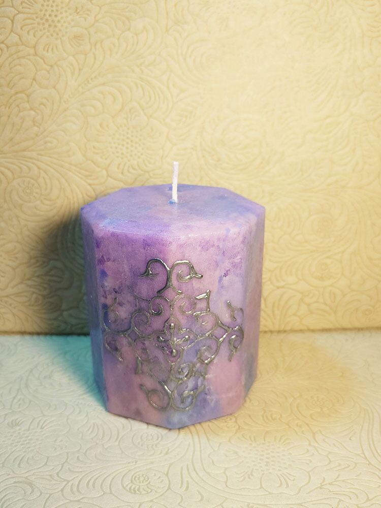 ピンク・ダークブルー・パープルのミックスカラーのキャンドルに、繊細で美しいウィルタ文様を描いています。