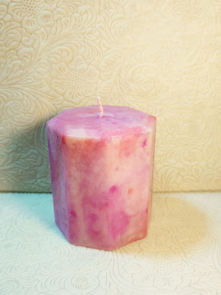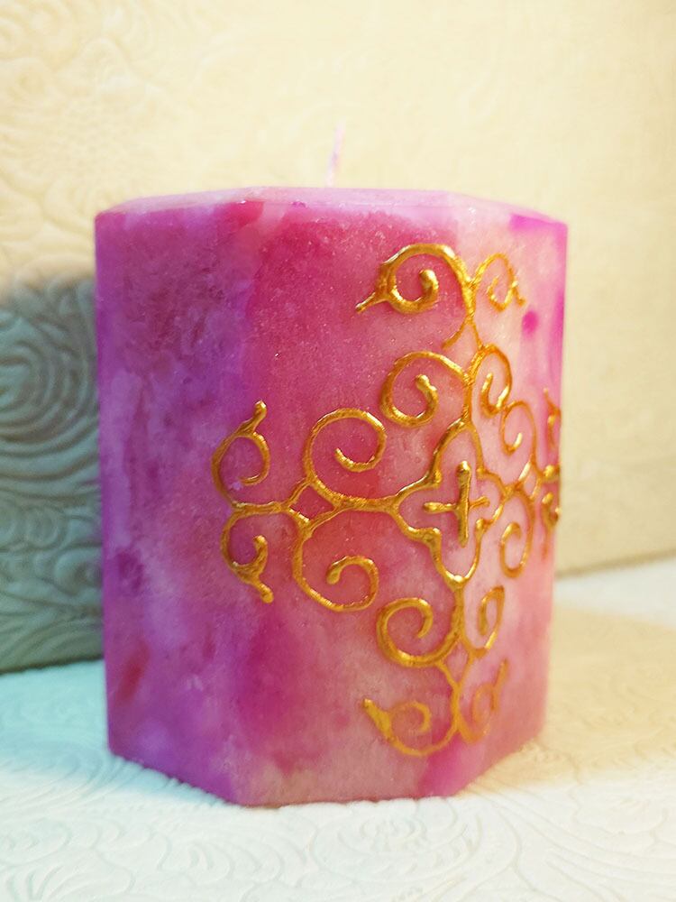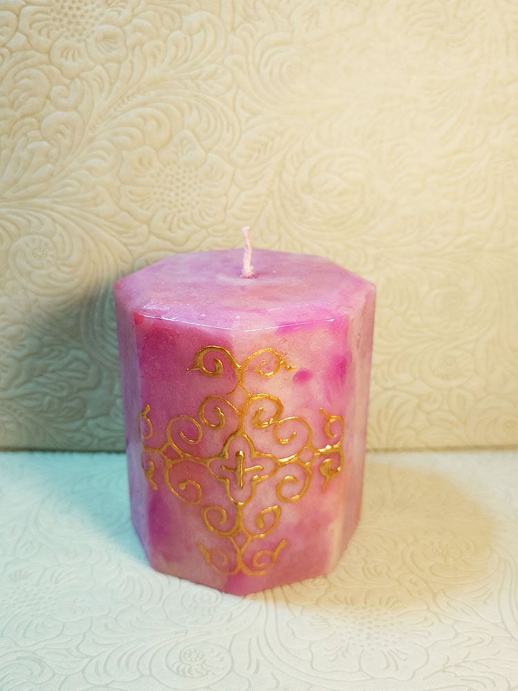 ピンク・レッド・ライトピンクのミックスカラーのキャンドルに、繊細で美しいウィルタ文様を描いています。
