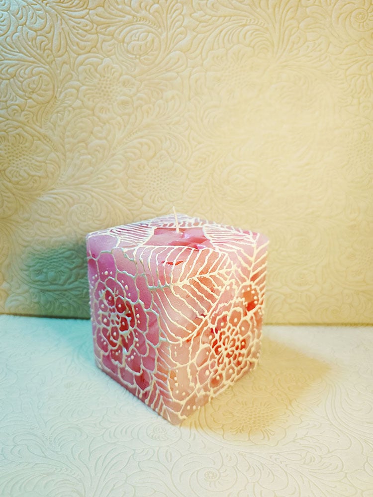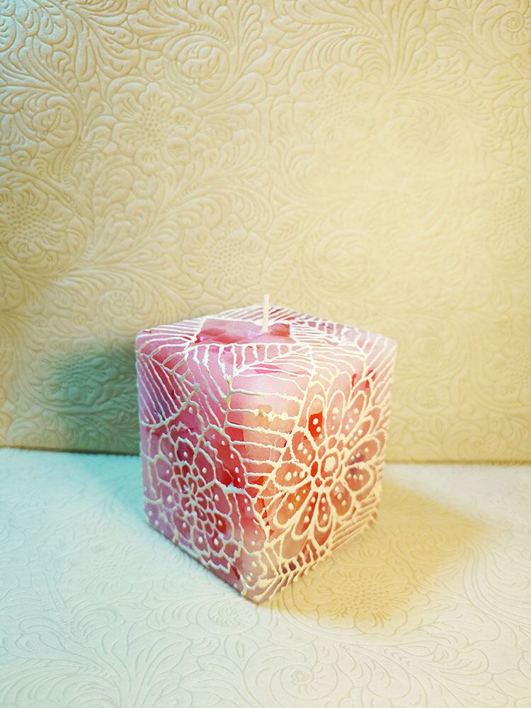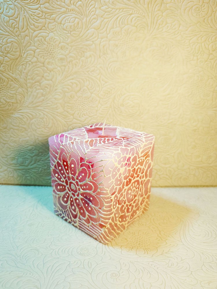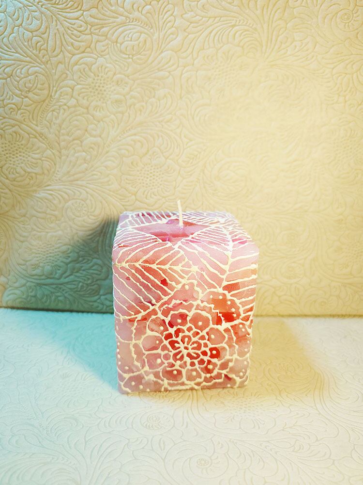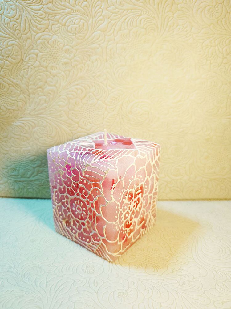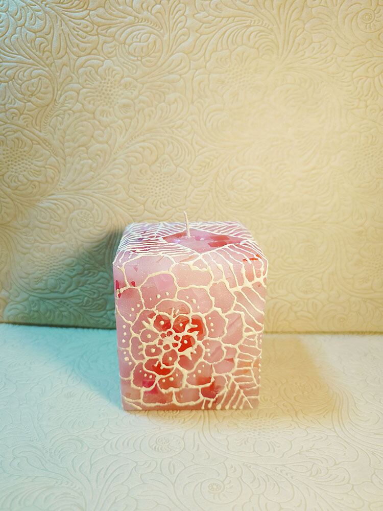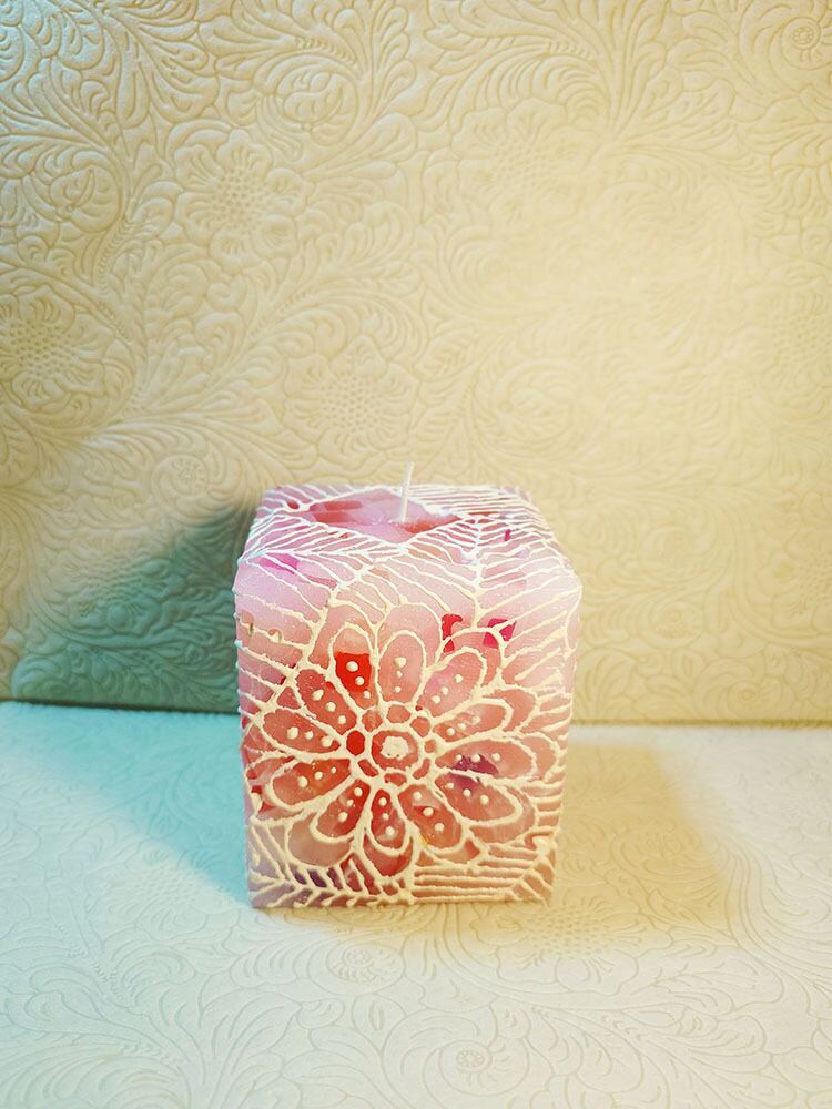 四角いピンク~ホワイトミックスのキャンドルの表面に、鮮やかな花や葉が描かれています。